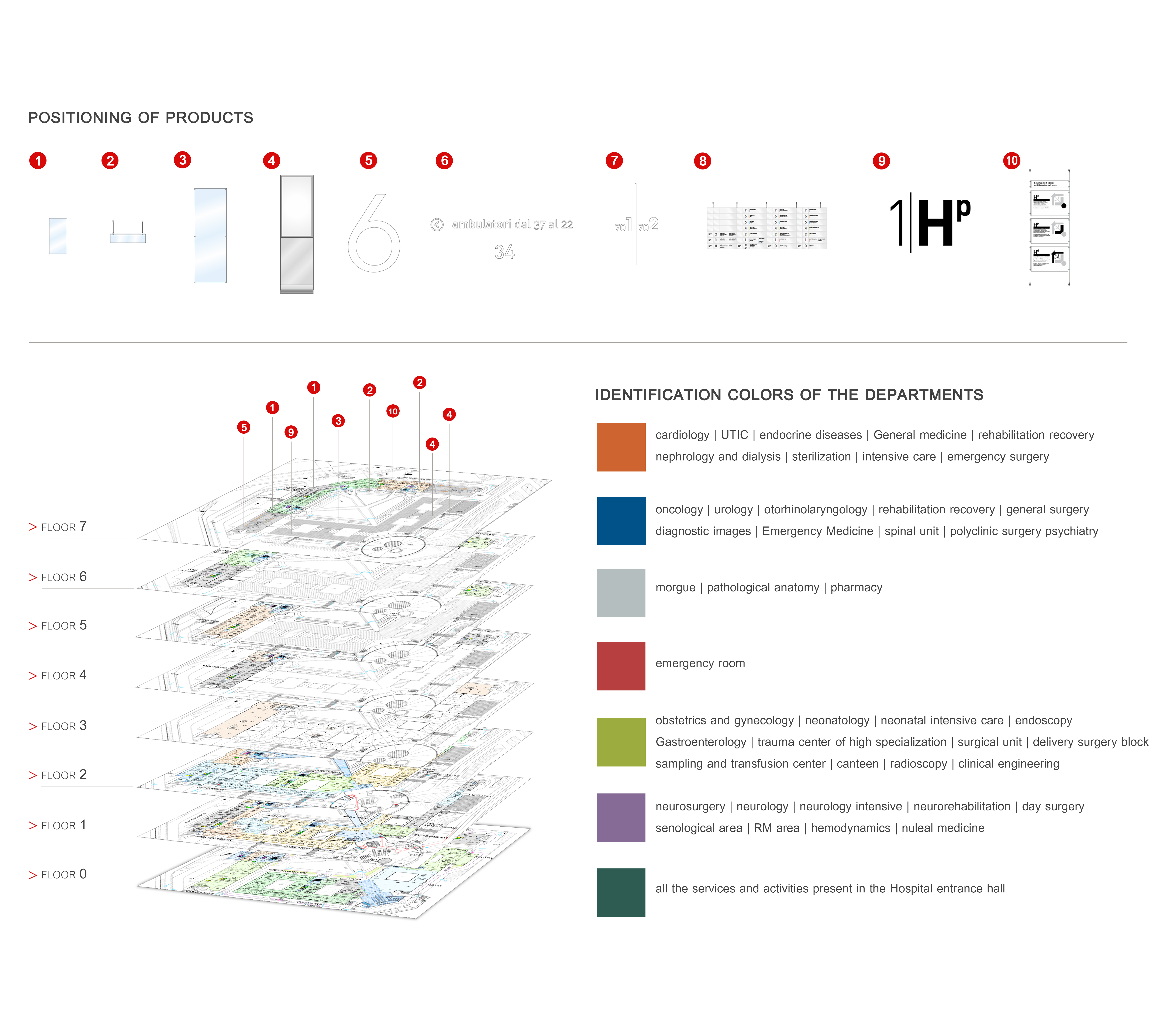 La segnaletica direzionale è stata realizzata attraverso soluzioni a parete, autoportanti e sospese. Nelle hall di ogni piano sono stati posizionati dei TOTEM INDEX riepilogativi, affiancati da delle composizioni ALLFLEX su cavi con grafica removibile su supporto cartaceo. Le directory di piano orizzontali della serie GRAPHIC forniscono un breve sommario per ogni area dell’ospedale e sono supportate dagli elementi di segnaletica sospesa, con indicazioni dei singoli reparti, della linea EXCHANGE che prevede il cambio messaggio.