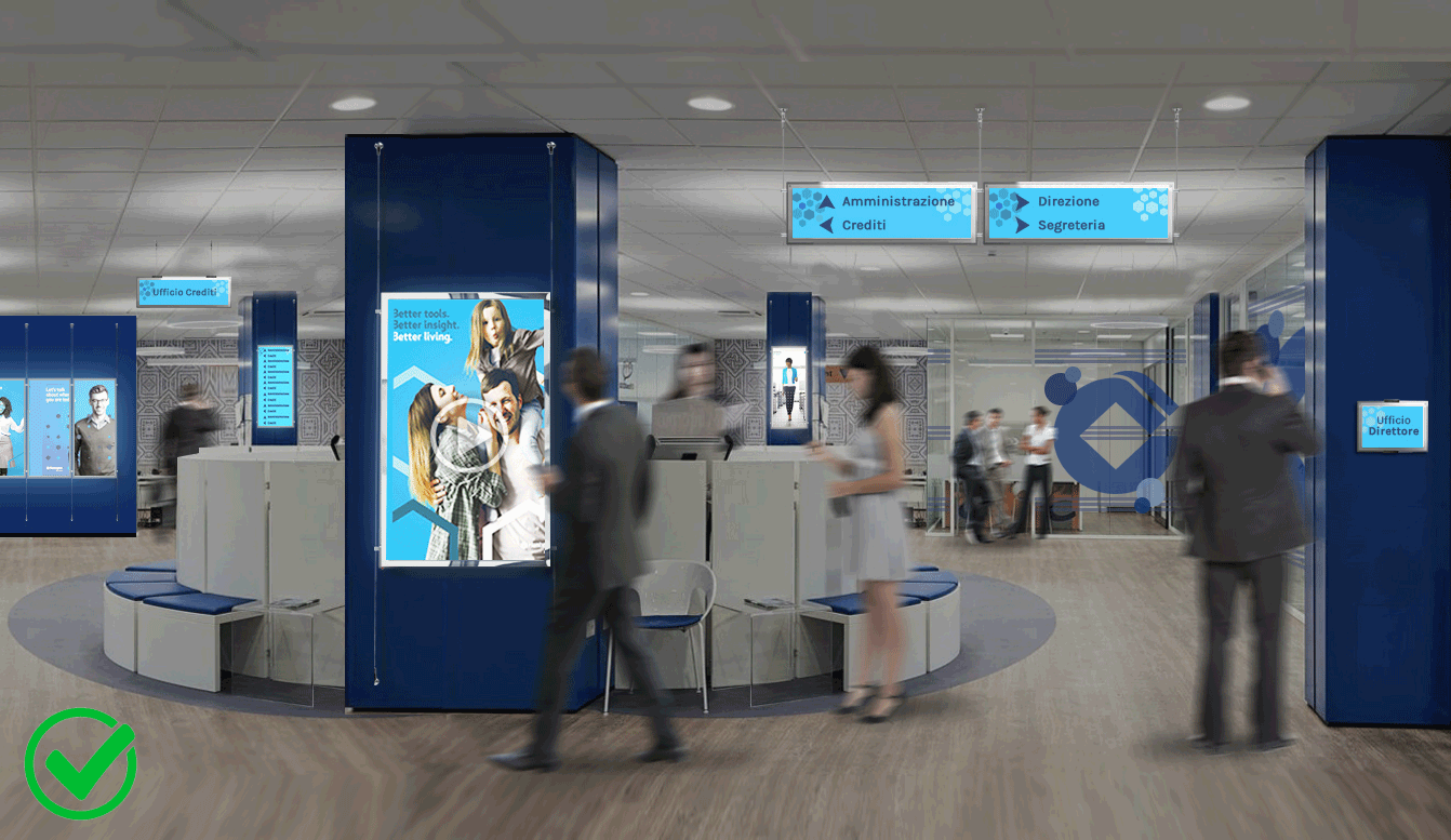 Grâce à nos systèmes multimédias et d'éclairage, la communication visuelle de la banque est mise en valeur et davantage remarquée par le passant.