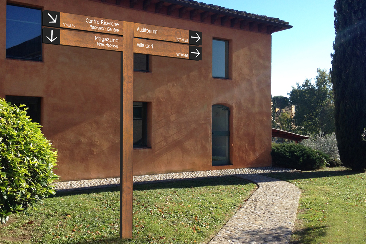Il progetto è stato ideato tenendo in considerazione le esigenze legate alla segnaletica direzionale unite al contesto paesaggistico, con l’obiettivo di vivere e far vivere il luogo. Come elemento distintivo del progetto di segnaletica, abbiamo accolto l’idea iniziale di utilizzare come materiale principale l’acciaio COR-TEN , un materiale visivamente caldo e adatto ai colori del sito Novartis (GSK) ed al territorio senese.