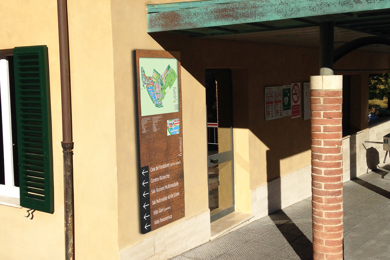 Prodotti unici, eleganti e ad alto d’impatto visivo che vengono inseriti in un contesto ampio e articolato creando un percorso direzionale ben chiaro fornendo all’utente tutte le informazioni di cui necessita. Questi supporti sono realizzati in acciao COR-TEN con un telaio interno a vista in alluminio zincato e verniciato di nero, con testi segnaletici e frecce incise a laser, oltre alla personalizzazione con logo “Novartis” sempre a laser. Sono stati progettati e installati vari supporti, come ad esempio le strutture autoportanti direzionali a 2, a 3 o a 5 braccia, i funzionali leggii dedicati alla spiegazione dei vari punti d’interesse, i totem autoportanti con le indicazioni della planimentria e dei vari edifici presenti nel sito, varie targhe identificative di piccolo formato e l’originale percorso composto da mattonelle in acciaio finitura ottone lucido che indica l’antico percorso sotterraneo dei Bottini (XII – XV).